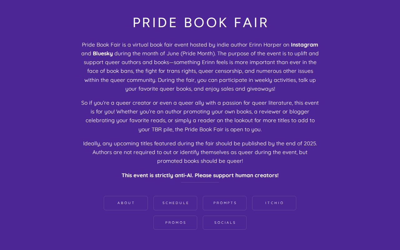 Pride Book Fair - June 2025 - This Pride Month, celebrate the vibrant works and voices of queer authors all over the world. Participate in weekly events, share and wishlist your favorite queer books, and enjoy sales and giveaways! Open to authors, readers, reviewers, and all book lovers! - pridebookfair.carrd.co