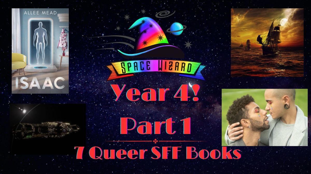 June 2025 - LGBTQ+ Science Fiction & Fantasy - Hosted by Space Wizard Science Fantasy - Background is of a white wall with numbered books along the bottom, set up in order to make a rainbow. Black button with text that says "Support LGBTQ+ Books"
